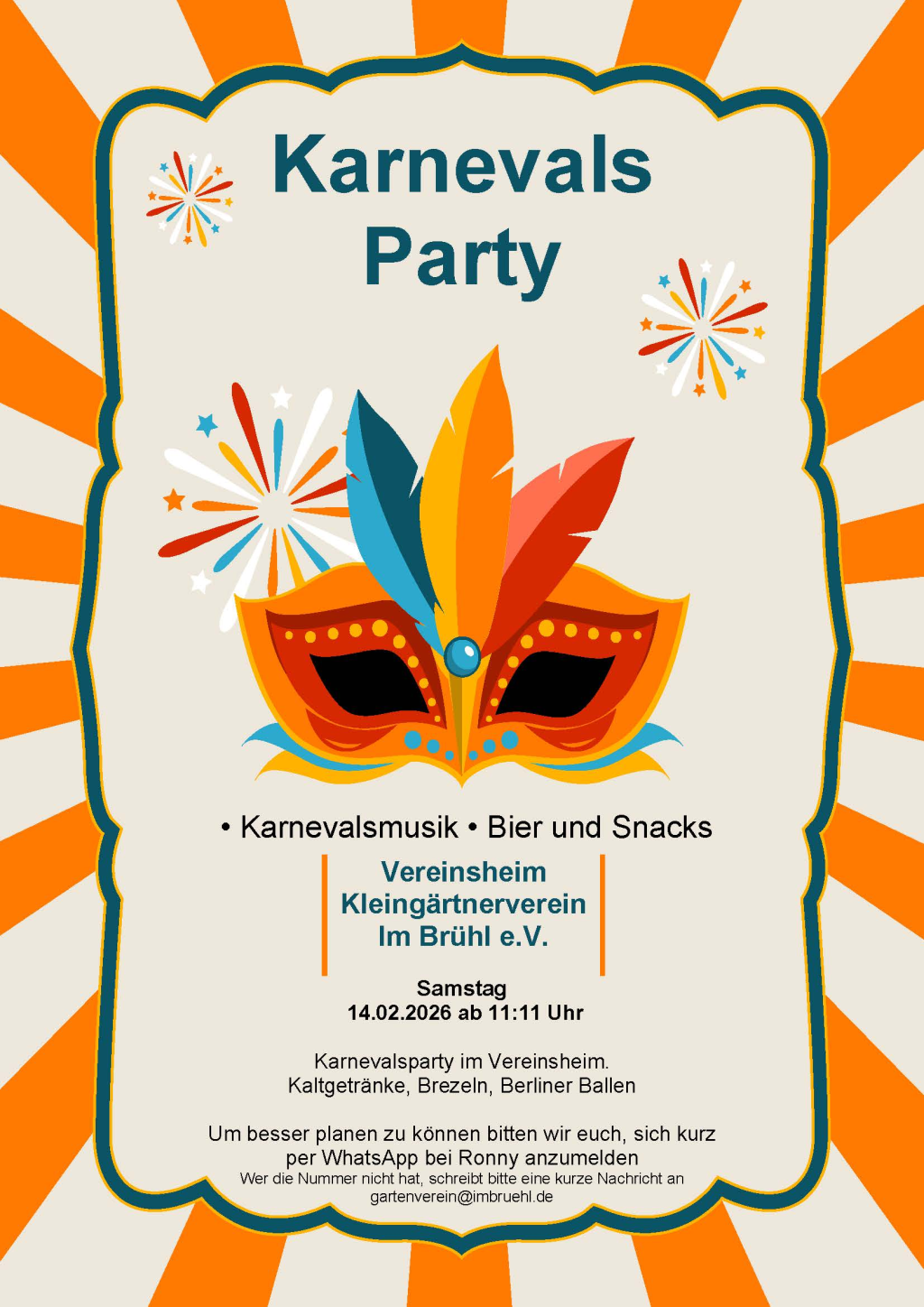 | 14.02.2026 | Beginn: 11:11 Uhr | Karnevals-Party | Vereinsheim | Flyer |